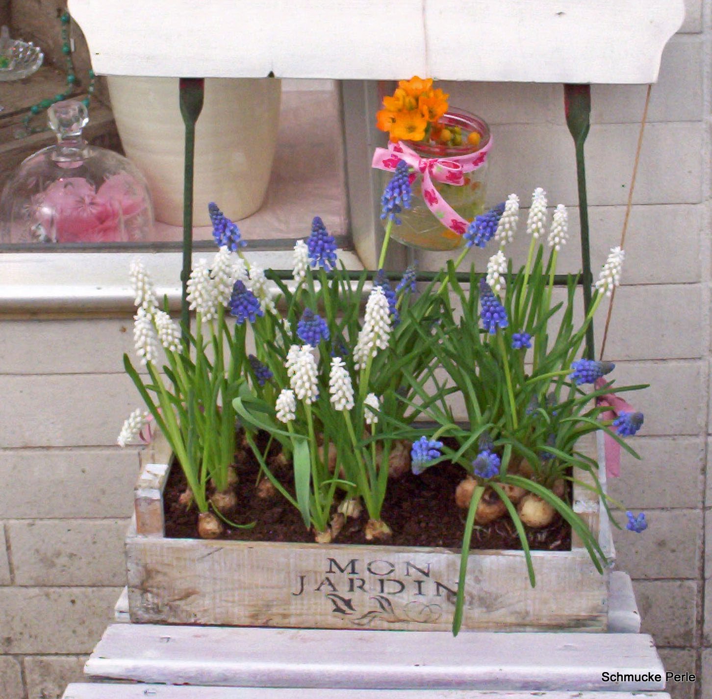Das Schaufenster von Schmucke Perle im Februar: RosenRot statt einheitsgrau. |